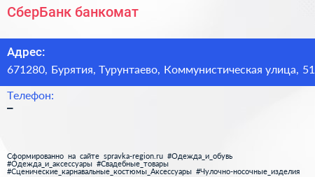 СберБанк, банкомат по адресу 671280, Бурятия, Турунтаево, Коммунистическая улица, 51 в дальнейшем Организация, размещена в следующих категориях: