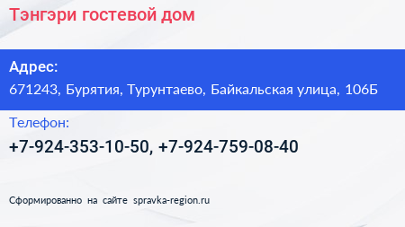 Тэнгэри, гостевой дом по адресу 671243, Бурятия, Турунтаево, Байкальская улица, 106Б в дальнейшем Организация, размещена в следующих категориях: