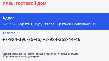 Улзы, гостевой дом по адресу 671272, Бурятия, Турунтаево, Братьев Волковых, 31 в дальнейшем Организация, размещена в следующих категориях: