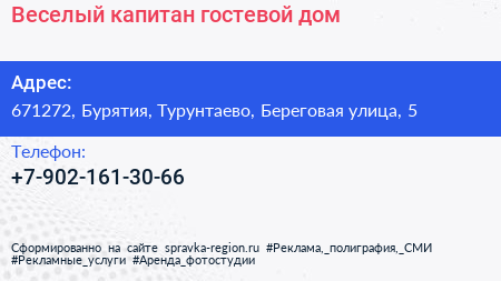 Веселый капитан, гостевой дом по адресу 671272, Бурятия, Турунтаево, Береговая улица, 5 в дальнейшем Организация, размещена в следующих категориях: