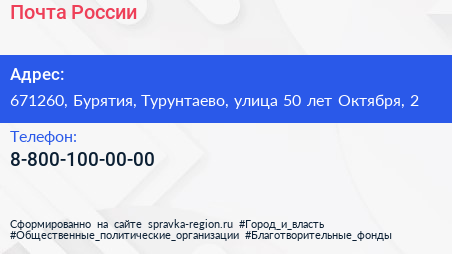 Почта России по адресу 671260, Бурятия, Турунтаево, улица 50 лет Октября, 2 в дальнейшем Организация, размещена в следующих категориях: