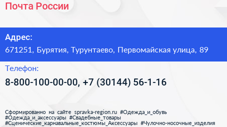 Почта России по адресу 671251, Бурятия, Турунтаево, Первомайская улица, 89 в дальнейшем Организация, размещена в следующих категориях: