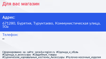Для вас, магазин по адресу 671280, Бурятия, Турунтаево, Коммунистическая улица, 50а в дальнейшем Организация, размещена в следующих категориях: