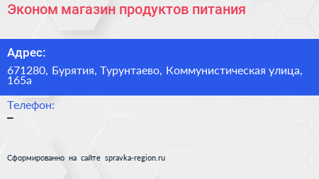 Эконом, магазин продуктов питания по адресу 671280, Бурятия, Турунтаево, Коммунистическая улица, 165а в дальнейшем Организация, размещена в следующих категориях: