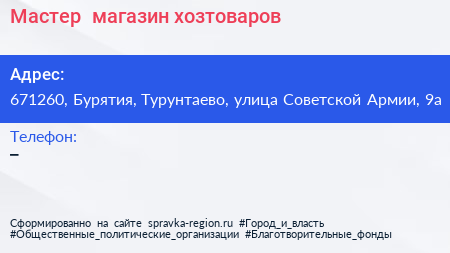 Мастер+, магазин хозтоваров по адресу 671260, Бурятия, Турунтаево, улица Советской Армии, 9а в дальнейшем Организация, размещена в следующих категориях: