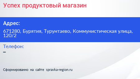 Успех, продуктовый магазин по адресу 671280, Бурятия, Турунтаево, Коммунистическая улица, 120/2 в дальнейшем Организация, размещена в следующих категориях:
