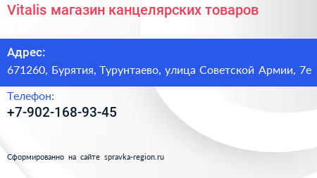 Vitalis, магазин канцелярских товаров по адресу 671260, Бурятия, Турунтаево, улица Советской Армии, 7е в дальнейшем Организация, размещена в следующих категориях: