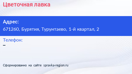 Цветочная лавка по адресу 671260, Бурятия, Турунтаево, 1-й квартал, 2 в дальнейшем Организация, размещена в следующих категориях: