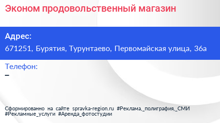Эконом, продовольственный магазин по адресу 671251, Бурятия, Турунтаево, Первомайская улица, 36а в дальнейшем Организация, размещена в следующих категориях: