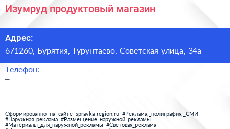 Изумруд, продуктовый магазин по адресу 671260, Бурятия, Турунтаево, Советская улица, 34а в дальнейшем Организация, размещена в следующих категориях: