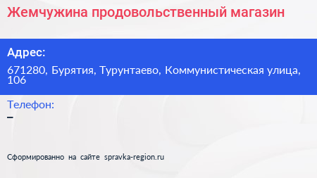Жемчужина, продовольственный магазин по адресу 671280, Бурятия, Турунтаево, Коммунистическая улица, 106 в дальнейшем Организация, размещена в следующих категориях: