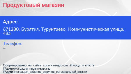 Продуктовый магазин по адресу 671280, Бурятия, Турунтаево, Коммунистическая улица, 48а в дальнейшем Организация, размещена в следующих категориях: