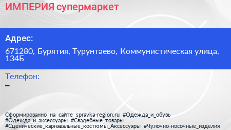 ИМПЕРИЯ, супермаркет по адресу 671280, Бурятия, Турунтаево, Коммунистическая улица, 134Б в дальнейшем Организация, размещена в следующих категориях: