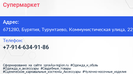 Супермаркет по адресу 671280, Бурятия, Турунтаево, Коммунистическая улица, 22 в дальнейшем Организация, размещена в следующих категориях: