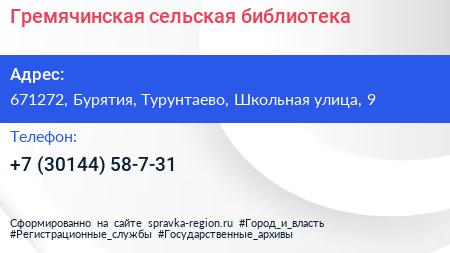 Гремячинская сельская библиотека по адресу 671272, Бурятия, Турунтаево, Школьная улица, 9 в дальнейшем Организация, размещена в следующих категориях: