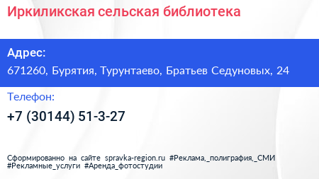 Иркиликская сельская библиотека по адресу 671260, Бурятия, Турунтаево, Братьев Седуновых, 24 в дальнейшем Организация, размещена в следующих категориях:
