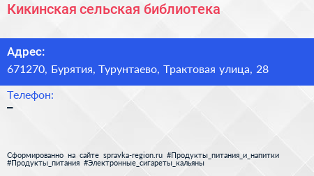 Кикинская сельская библиотека по адресу 671270, Бурятия, Турунтаево, Трактовая улица, 28 в дальнейшем Организация, размещена в следующих категориях: