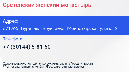 Сретенский женский монастырь по адресу 671265, Бурятия, Турунтаево, Монастырская улица, 2 в дальнейшем Организация, размещена в следующих категориях: