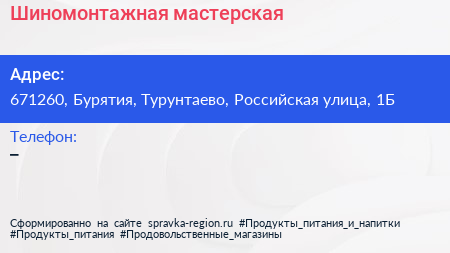 Шиномонтажная мастерская по адресу 671260, Бурятия, Турунтаево, Российская улица, 1Б в дальнейшем Организация, размещена в следующих категориях: