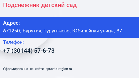 Подснежник, детский сад по адресу 671250, Бурятия, Турунтаево, Юбилейная улица, 87 в дальнейшем Организация, размещена в следующих категориях: