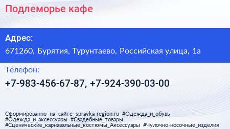 Подлеморье, кафе по адресу 671260, Бурятия, Турунтаево, Российская улица, 1а в дальнейшем Организация, размещена в следующих категориях: