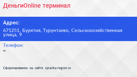 ДеньгиOnline, терминал по адресу 671251, Бурятия, Турунтаево, Сельскохозяйственная улица, 9 в дальнейшем Организация, размещена в следующих категориях: