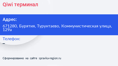 Qiwi, терминал по адресу 671280, Бурятия, Турунтаево, Коммунистическая улица, 129а в дальнейшем Организация, размещена в следующих категориях: