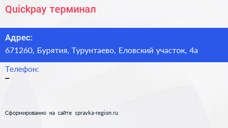 Quickpay, терминал по адресу 671260, Бурятия, Турунтаево, Еловский участок, 4а в дальнейшем Организация, размещена в следующих категориях: