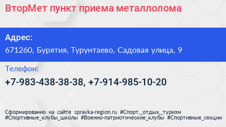 ВторМет, пункт приема металлолома по адресу 671260, Бурятия, Турунтаево, Садовая улица, 9 в дальнейшем Организация, размещена в следующих категориях: