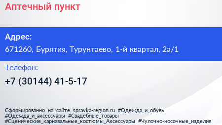 Аптечный пункт по адресу 671260, Бурятия, Турунтаево, 1-й квартал, 2а/1 в дальнейшем Организация, размещена в следующих категориях: