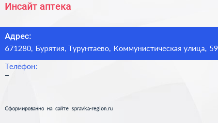 Инсайт, аптека по адресу 671280, Бурятия, Турунтаево, Коммунистическая улица, 59 в дальнейшем Организация, размещена в следующих категориях: