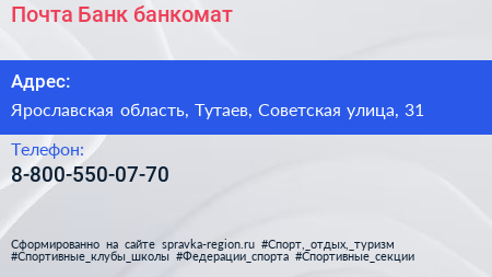 Почта Банк, банкомат по адресу Ярославская область, Тутаев, Советская улица, 31 в дальнейшем Организация, размещена в следующих категориях: