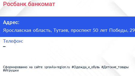 Росбанк, банкомат по адресу Ярославская область, Тутаев, проспект 50 лет Победы, 29а в дальнейшем Организация, размещена в следующих категориях: