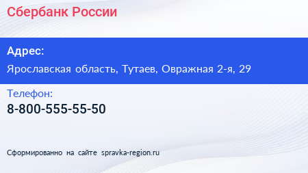 Сбербанк России по адресу Ярославская область, Тутаев, Овражная 2-я, 29 в дальнейшем Организация, размещена в следующих категориях: