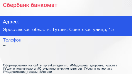 Сбербанк, банкомат по адресу Ярославская область, Тутаев, Советская улица, 15 в дальнейшем Организация, размещена в следующих категориях: