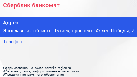 Сбербанк, банкомат по адресу Ярославская область, Тутаев, проспект 50 лет Победы, 7 в дальнейшем Организация, размещена в следующих категориях: