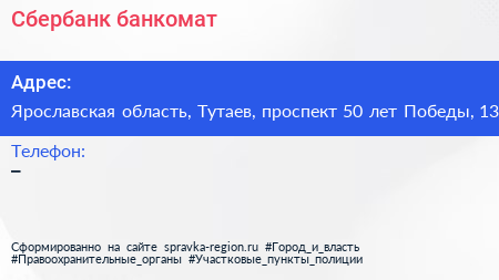 Сбербанк, банкомат по адресу Ярославская область, Тутаев, проспект 50 лет Победы, 13 в дальнейшем Организация, размещена в следующих категориях: