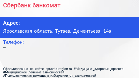 Сбербанк, банкомат по адресу Ярославская область, Тутаев, Дементьева, 14а в дальнейшем Организация, размещена в следующих категориях:
