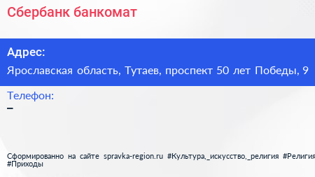 Сбербанк, банкомат по адресу Ярославская область, Тутаев, проспект 50 лет Победы, 9 в дальнейшем Организация, размещена в следующих категориях: