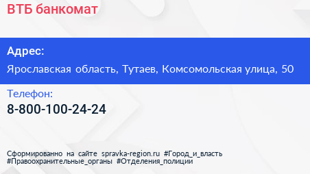 ВТБ, банкомат по адресу Ярославская область, Тутаев, Комсомольская улица, 50 в дальнейшем Организация, размещена в следующих категориях: