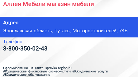 Аллея Мебели, магазин мебели по адресу Ярославская область, Тутаев, Моторостроителей, 74Б в дальнейшем Организация, размещена в следующих категориях: