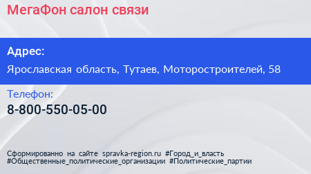 МегаФон, салон связи по адресу Ярославская область, Тутаев, Моторостроителей, 58 в дальнейшем Организация, размещена в следующих категориях: