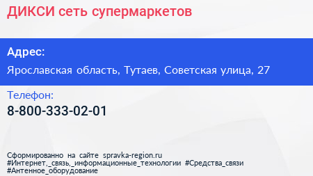 ДИКСИ, сеть супермаркетов по адресу Ярославская область, Тутаев, Советская улица, 27 в дальнейшем Организация, размещена в следующих категориях: