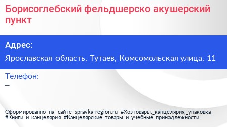 Борисоглебский фельдшерско-акушерский пункт по адресу Ярославская область, Тутаев, Комсомольская улица, 11 в дальнейшем Организация, размещена в следующих категориях: