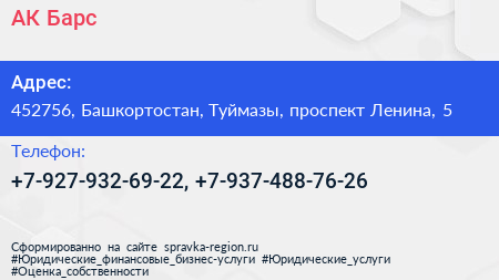 АК Барс по адресу 452756, Башкортостан, Туймазы, проспект Ленина, 5 в дальнейшем Организация, размещена в следующих категориях:
