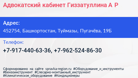 Адвокатский кабинет Гиззатуллина А.Р. по адресу 452754, Башкортостан, Туймазы, Пугачёва, 19Б в дальнейшем Организация, размещена в следующих категориях: