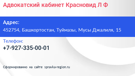 Адвокатский кабинет Красновид Л.Ф. по адресу 452754, Башкортостан, Туймазы, Мусы Джалиля, 15 в дальнейшем Организация, размещена в следующих категориях: