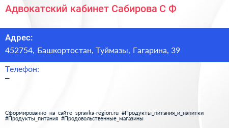 Адвокатский кабинет Сабирова С.Ф. по адресу 452754, Башкортостан, Туймазы, Гагарина, 39 в дальнейшем Организация, размещена в следующих категориях:
