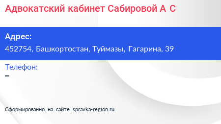 Адвокатский кабинет Сабировой А.С. по адресу 452754, Башкортостан, Туймазы, Гагарина, 39 в дальнейшем Организация, размещена в следующих категориях: