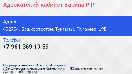 Адвокатский кабинет Варина Р.Р. по адресу 452754, Башкортостан, Туймазы, Пугачёва, 19Б в дальнейшем Организация, размещена в следующих категориях: